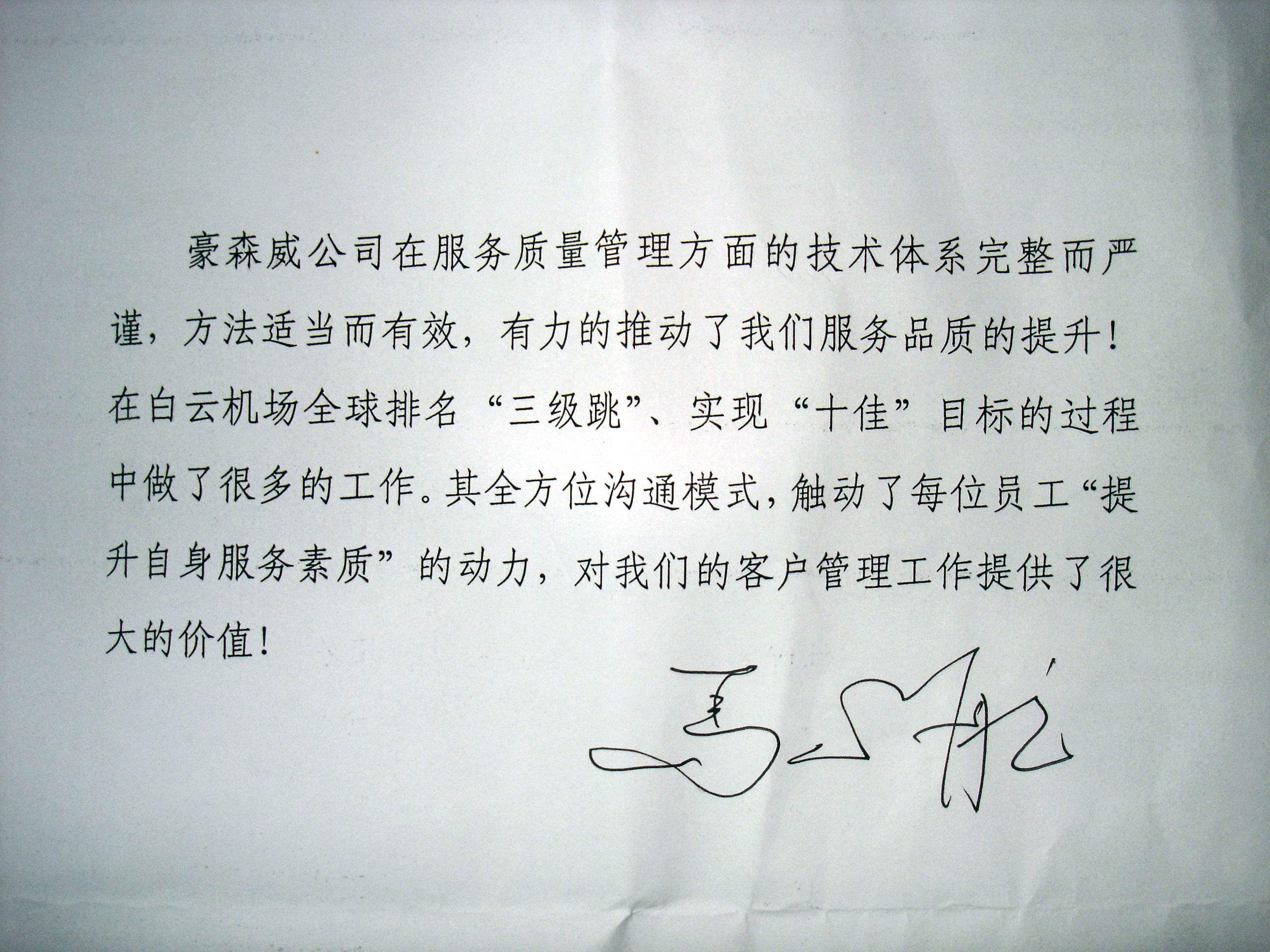 為此,2011年10月下旬,廣州白云機場向豪森威公司頒發(fā)了“杰出工作伙伴”的牌匾,主管服務方面工作的集團公司馬心航副總經(jīng)理提筆寫下了如下一段話贈與豪森威公司項目組成員共勉: